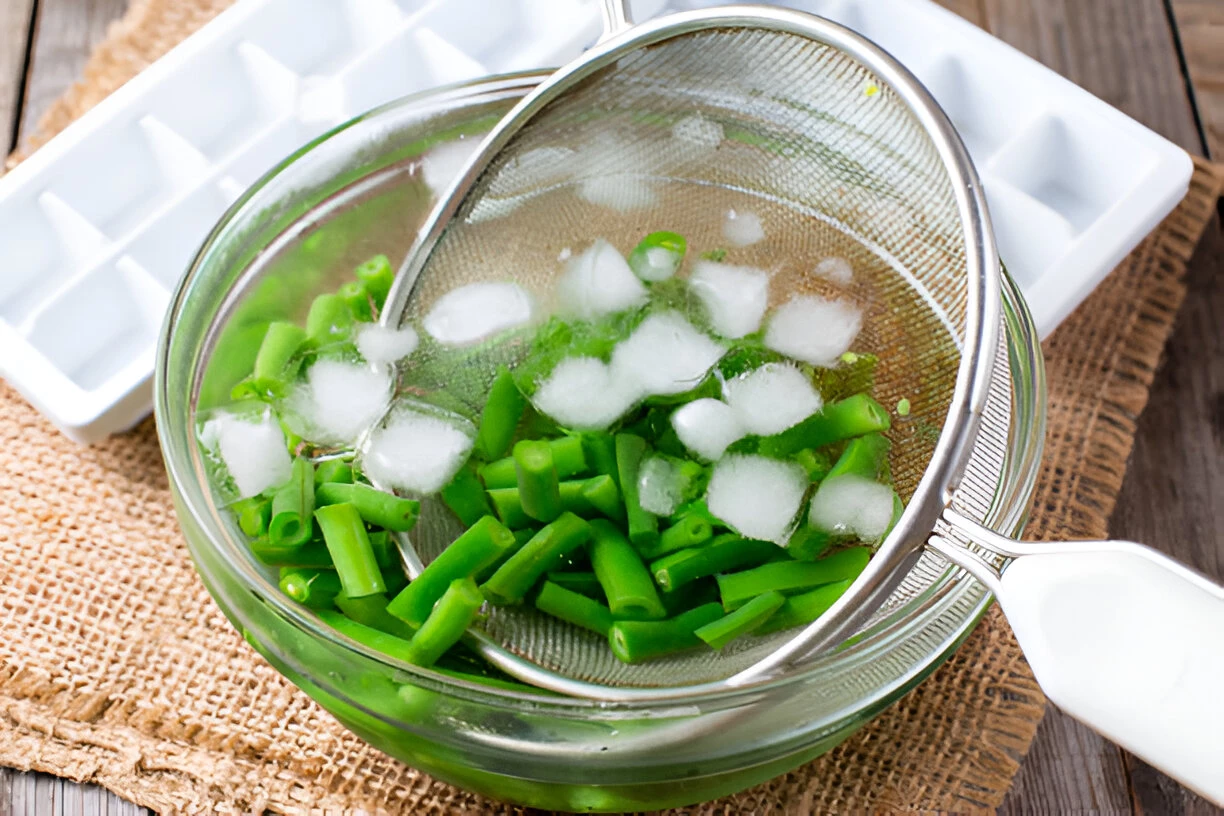 Segera angkat bahan yang telah direbus, dan rendam dalam air es selama waktu yang sama agar proses pemasakan berhenti seketika.